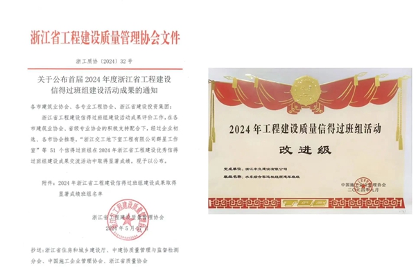 在2024年度工程建設(shè)質(zhì)量信得過班組比賽中,我公司水東樞紐項(xiàng)目團(tuán)隊(duì)獲得浙江省建設(shè)成果取得顯著成績班組和中國施工企業(yè)管理協(xié)會《2024年度工程建設(shè)質(zhì)量信得過班組改進(jìn)級》。