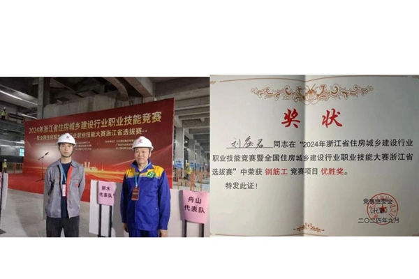 公司員工劉益君參加2024年浙江省住房城鄉(xiāng)建設(shè)行業(yè)職業(yè)技能競賽暨全國住房城鄉(xiāng)建設(shè)行業(yè)職業(yè)技能大賽中,榮獲“鋼筋工競賽項(xiàng)目優(yōu)勝獎”。