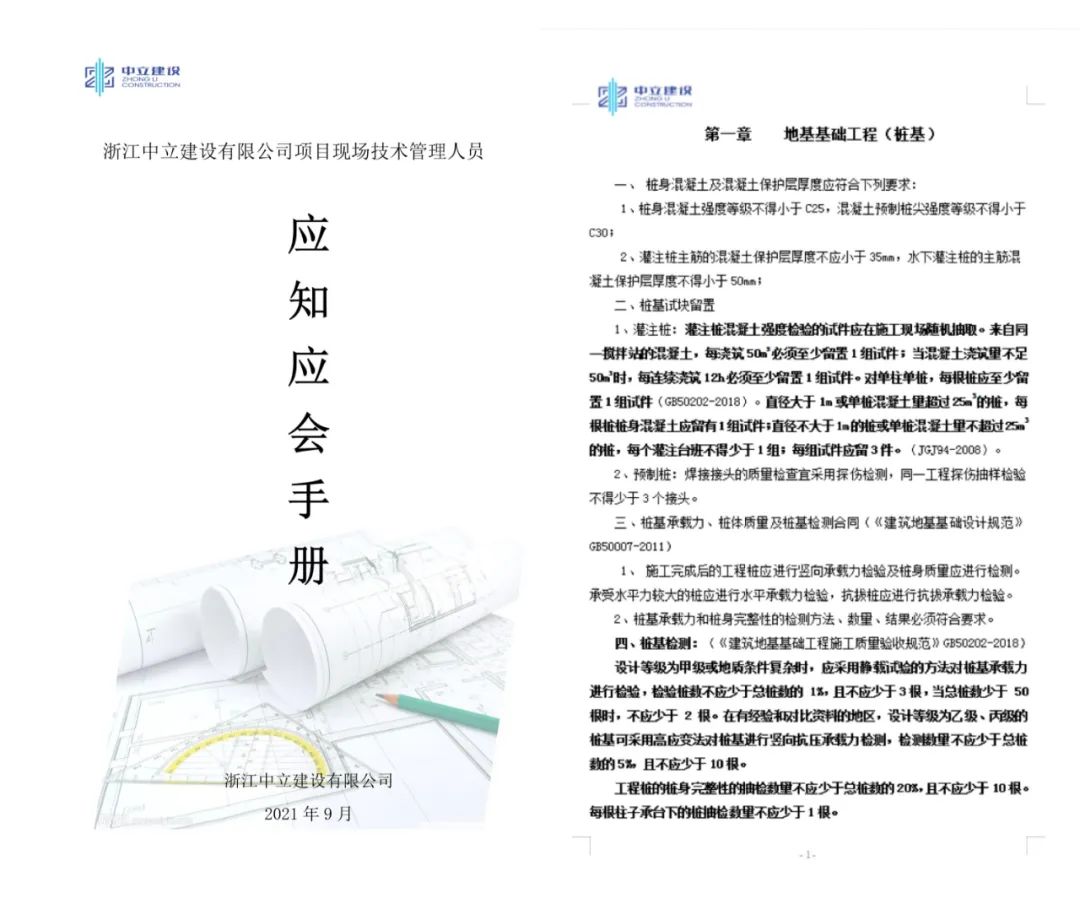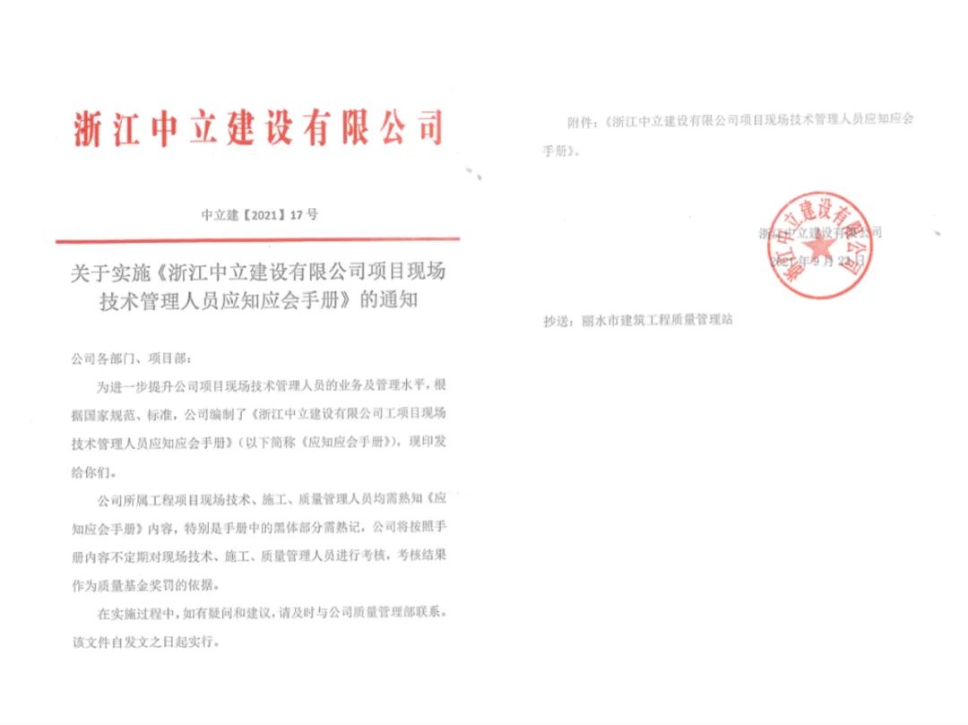 為進(jìn)一步提升公司項(xiàng)目現(xiàn)場技術(shù)管理人員的整體業(yè)務(wù)和管理水平,積極開展“質(zhì)量月”活動(dòng),根據(jù)國家標(biāo)準(zhǔn)規(guī)范,中立建設(shè)編制了《浙江中立建設(shè)有限公司工項(xiàng)目現(xiàn)場技術(shù)管理人員應(yīng)知應(yīng)會(huì)手冊》,并于9月23日發(fā)文實(shí)施。這是繼今年6月份我公司出臺的《工程質(zhì)量通病防治(2021試行)》后的又一重要技術(shù)性手冊。